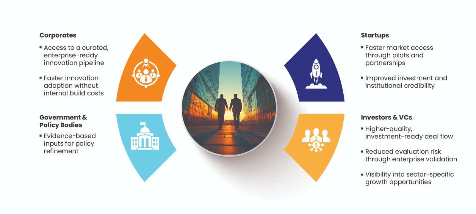 No. The cohort facilitates curated introductions and dialogue-led engagement. Commercial outcomes, if any, are at the discretion of the participating startups and corporates.